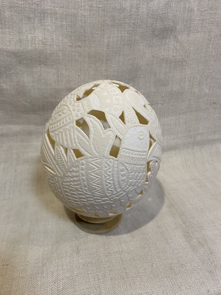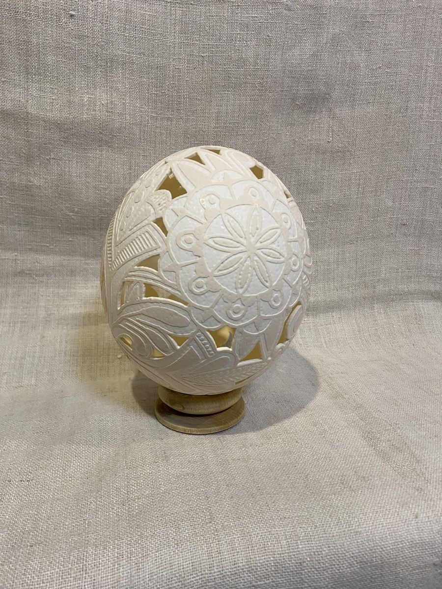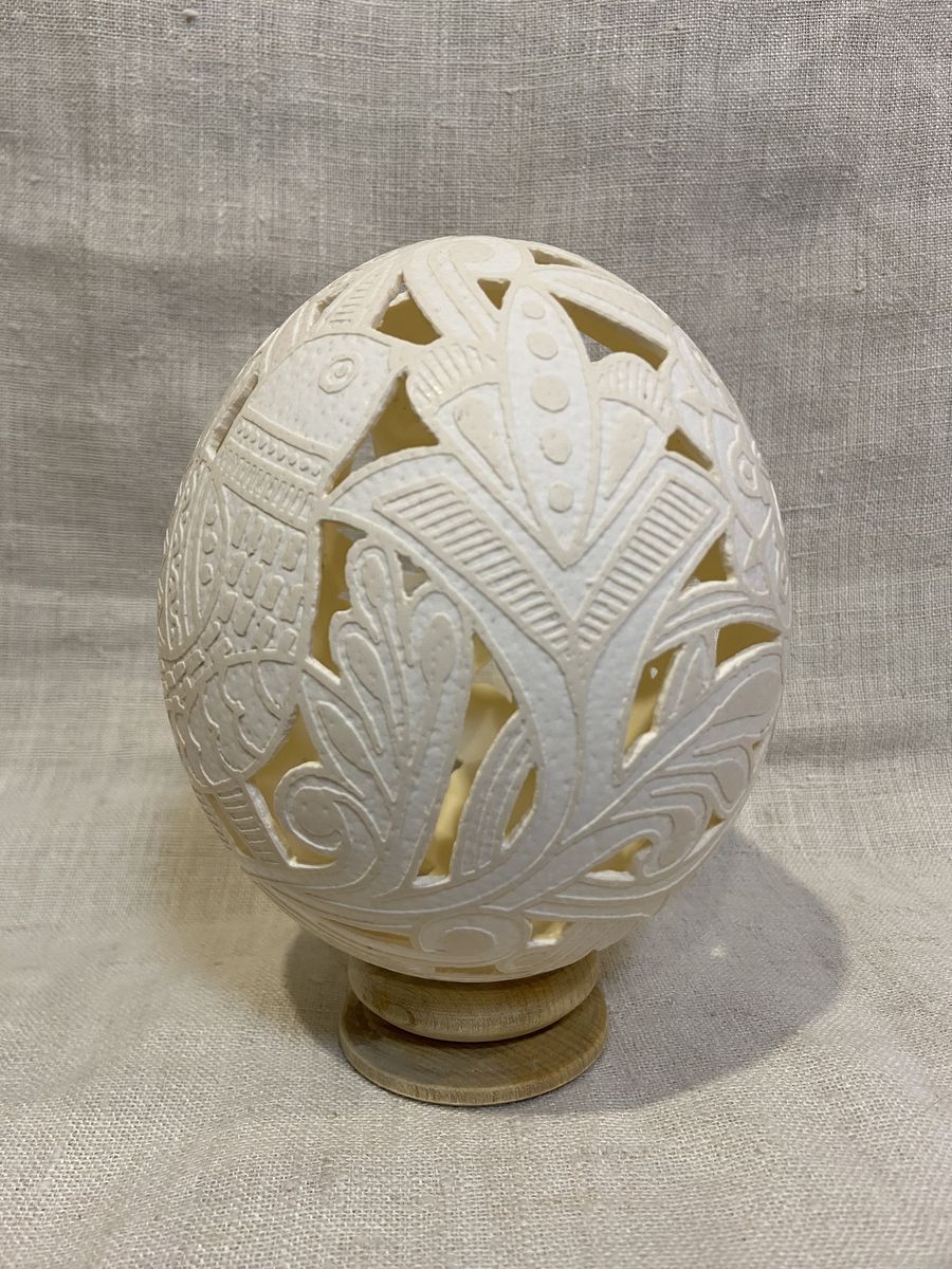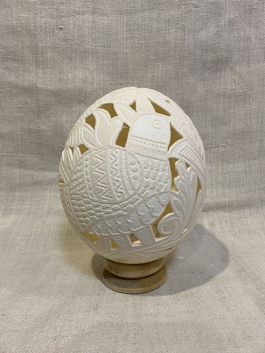 Писанка на страусиному яйці виконана в техніках витравлювання та вирізування.