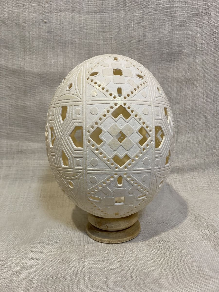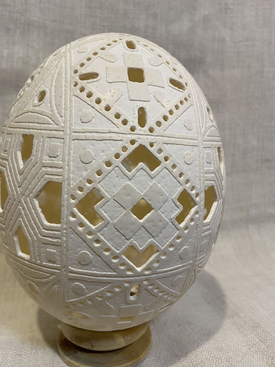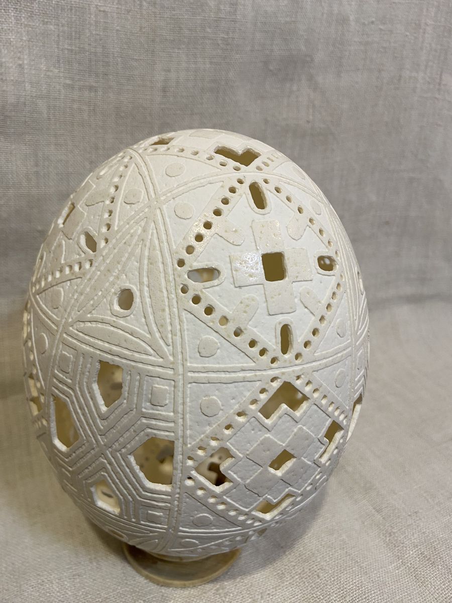 Писанка на страусиному яйці виконана в техніках витравлювання та вирізування.