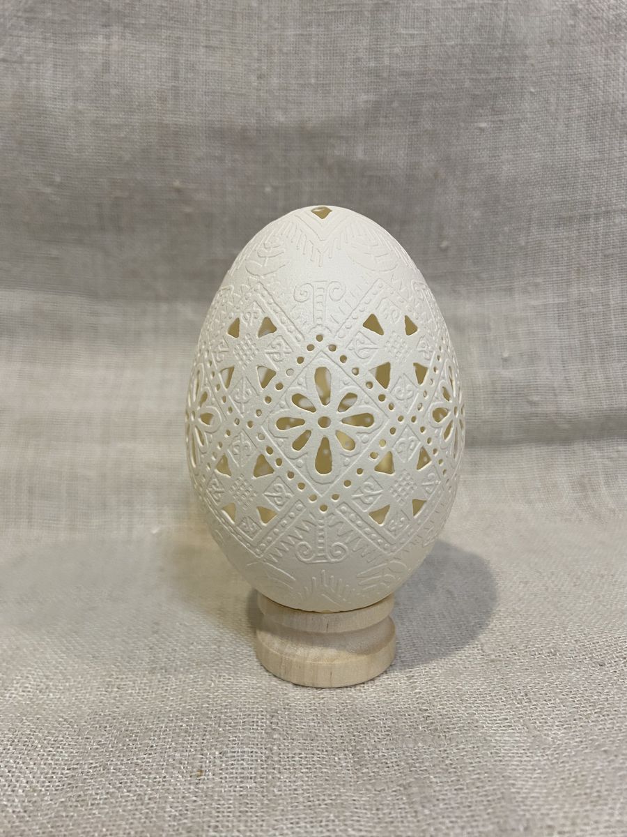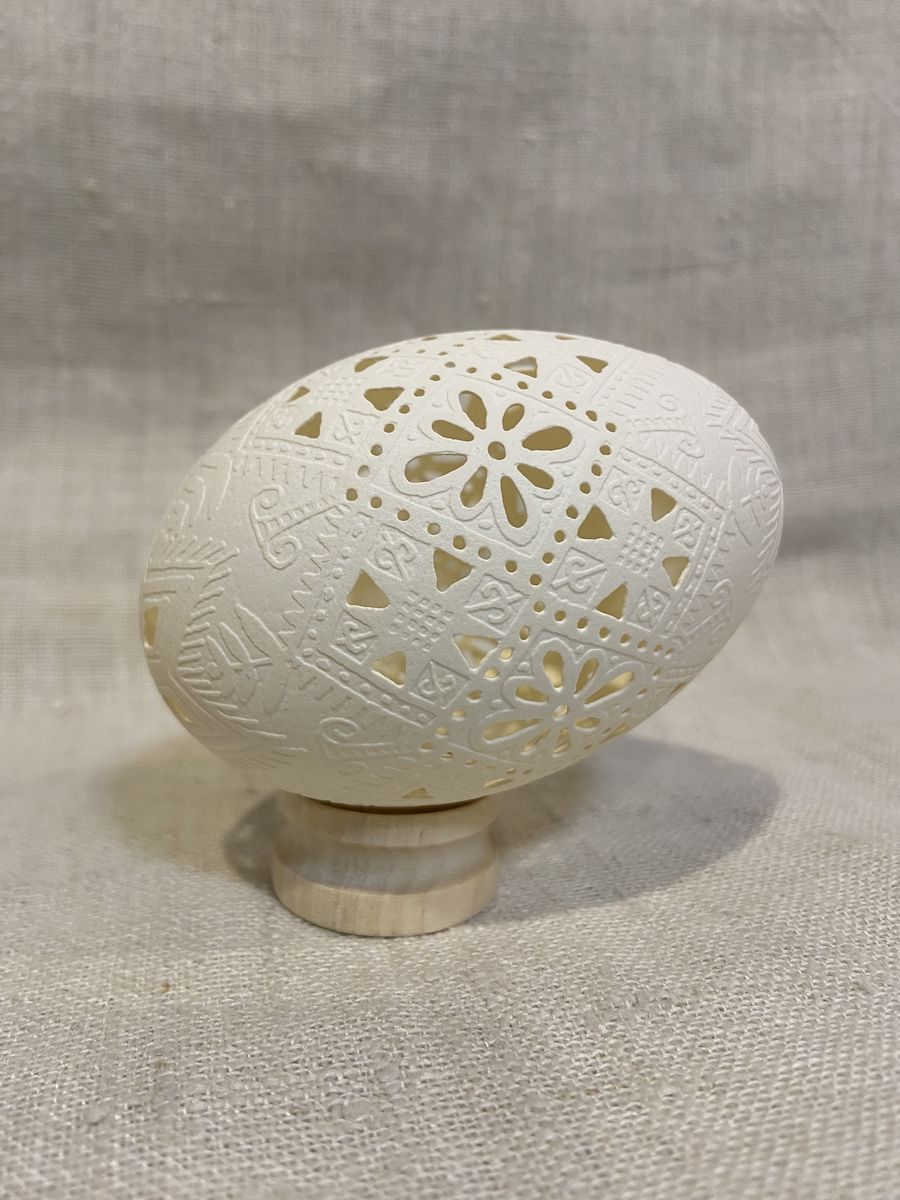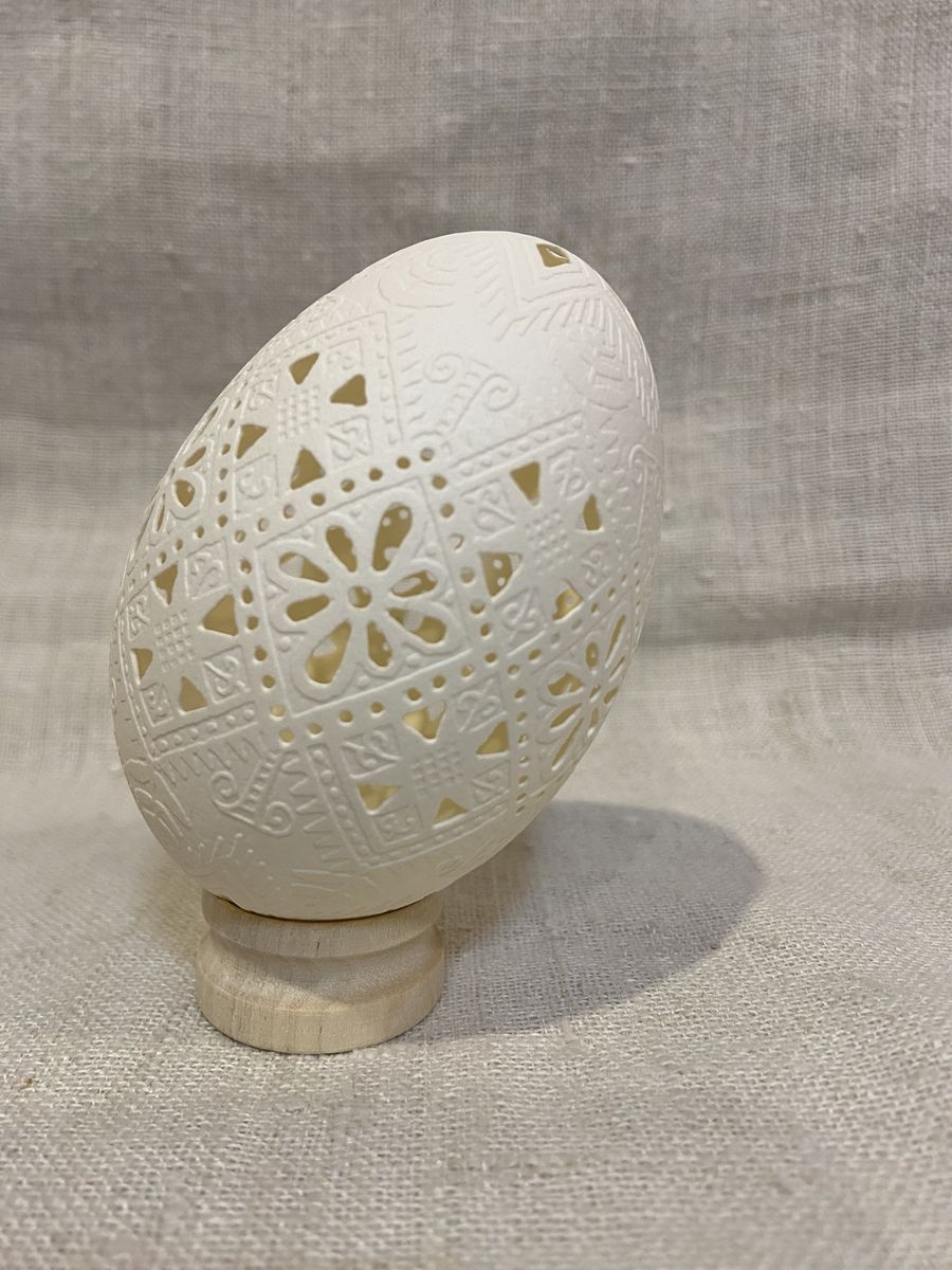 Писанка на гусячому яйці виконана у техніках витравлювання та вирізування.
