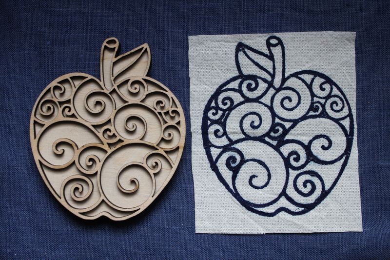 Губкою або валиком нанесіть фарбу на робочу поверхню штампа. Зробіть відбиток на тканині/папері міцно натиснувши штамп до матеріалу.