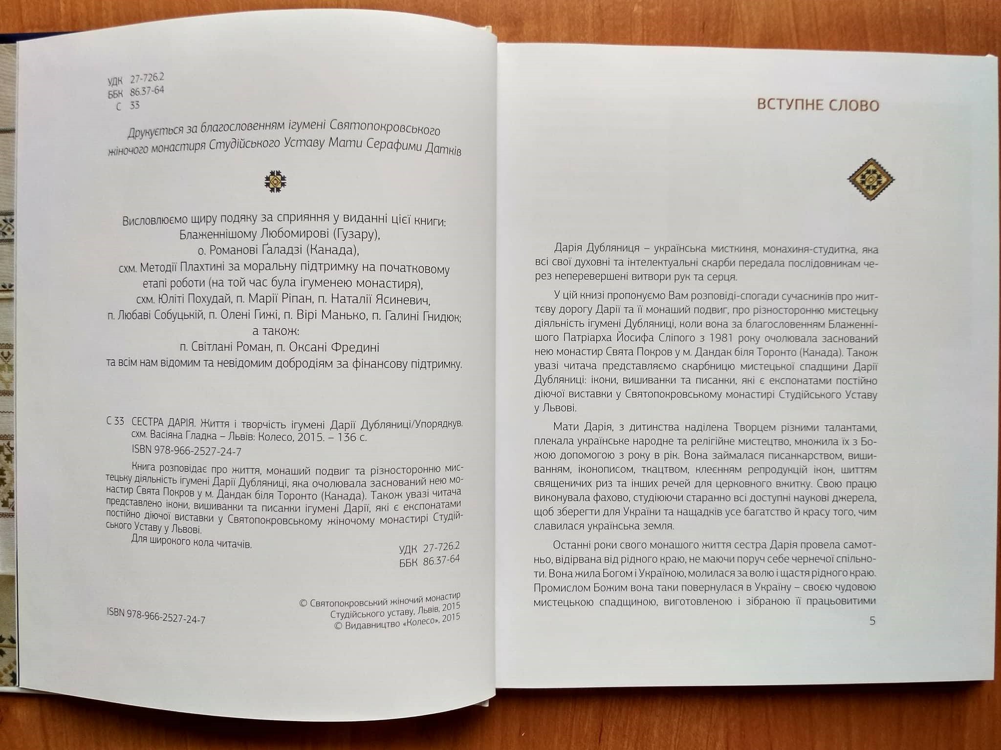 Книга розповідає про життя, монаший подвиг та різносторонню мистецьку діяльність ігумені Дарії Дубляниці, яка очолювала заснований нею монастир Свята Покров у м.Дандак біля Торонто (Канада). Також увазі читача представлено ікони, вишиванки та писанки ігумені Дарії, які є експонатами постійно діючої виставки у Святопокровському жіночому монастирі Студійського Уставу у Львові.