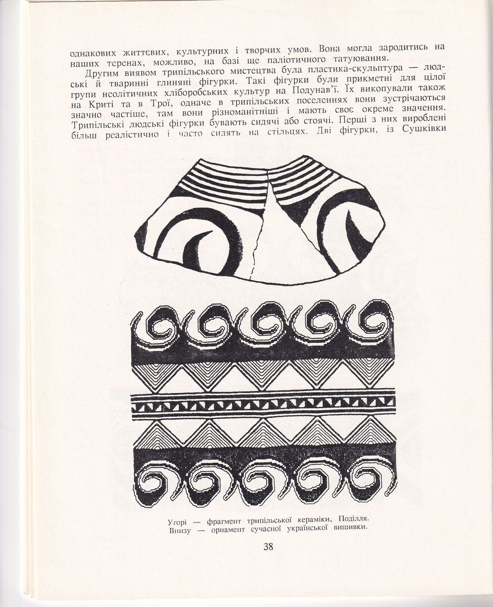 Книга “Орнамент трипільської культури і українська вишивка ХХ ст.” написана на підставі археологічних джерел праісторичних епох, які дають багатий, іноді єдиний матеріал для дослідження орнаменту, що був зібраний на українській землі. Очевидно, не всі знахідки є з місцевих пам’яток, але йдеться про впливи, які сюди проникали.