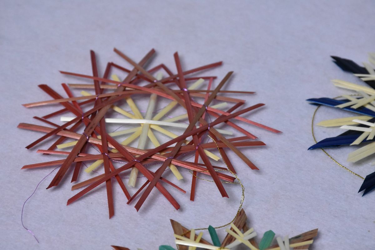 Сніжинки виготовлені із натуральної та фарбованої соломи.